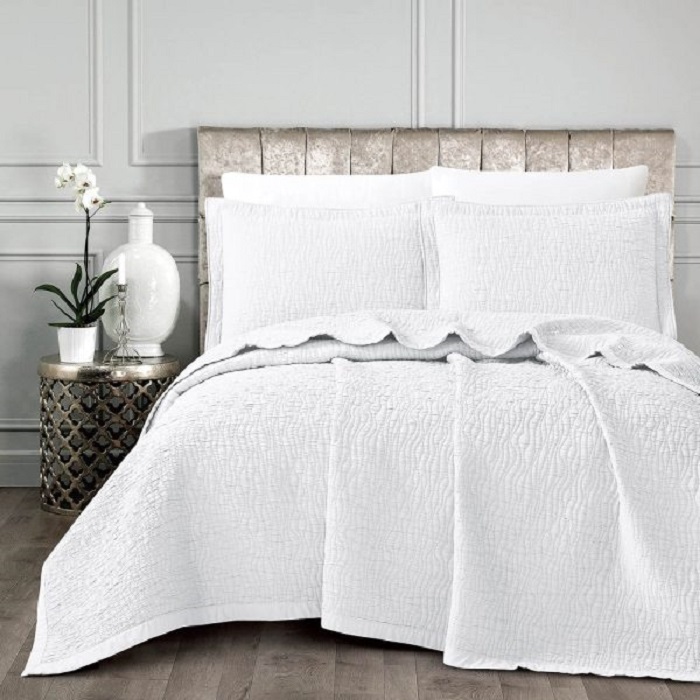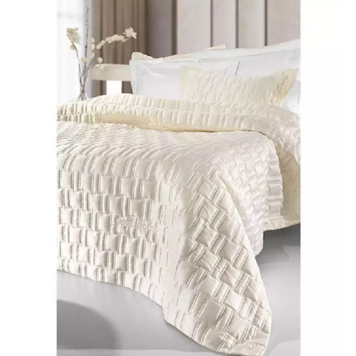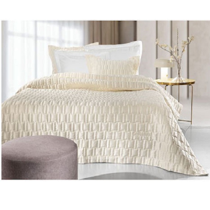 Σετ νυφικό κουβερλί από 100% Microfiber με γραμμικό πολύγαζο σχέδιο και βαμβακερή δαντέλα. Δεν συνίσταται το στεγνό καθάρισμα, το δυνατό στύψιμο και σίδερο σε μέγιστη θερμοκρασία 110°C