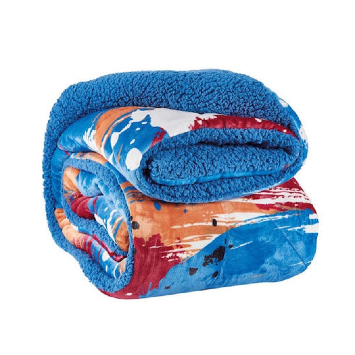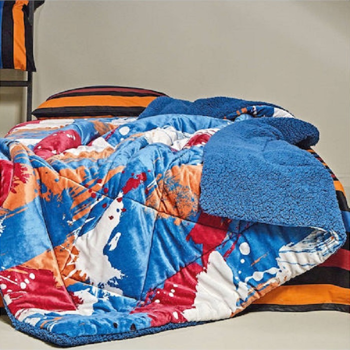 Κουβερτοπάπλωμα δύο όψεων, η μία από πολύ μαλακό ύφασμα fleece , βελούδινης αίσθησης από 100% polyester flannel fleece βάρους 230gr/m² και ή άλλη από 100% polyester sherpa βάρους 210gr/m²με γέμισμα από υποαλλεργικό υλικό 3D hollowfiber βάρους 260gr/m². Είναι πολύ ζεστό, μεγάλης αντοχής και εύκολο στη χρήση. Κατάλληλο για Μεσογειακό χειμώνα. Ενδείκνυται Πλύσιμο στους 40°C.