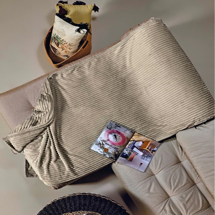 Fleece ριχτάρι με ριγέ ανάγλυφο σχέδιο. Τα Fleece υφάσματα είναι χνουδωτά, ζεστά, ελαφριά και ανθεκτικά. Δεν τσαλακώνουν, δεν χάνουν την φόρμα τους και έχουν πολύ μαλακή εμφάνιση και αίσθηση. Κατάλληλα για μια διακόσμηση πιο χαλαρή, πιο καθημερινή με θαλπωρή, ζεστασιά και casual κομψότητα.
