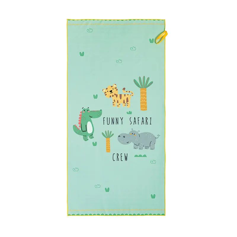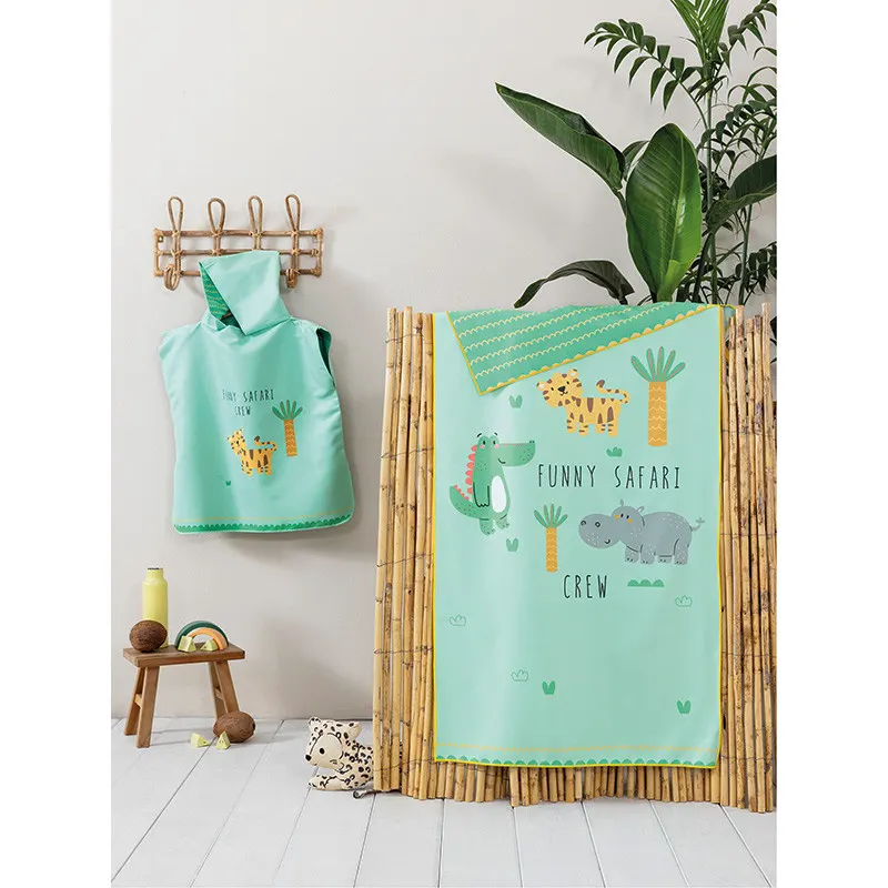 Η παιδική πετσέτα θαλάσσης Be Happy είναι δύο όψεων διαθέτει ένα περιπετειώδες σχέδιο με έναν κροκόδειλο, μια τίγρη και έναν ιπποπόταμο, σε ένα χαρούμενο σκηνικό σαφάρι με φοίνικες, που προσδίδει μια αίσθηση καλοκαιρινής περιπέτειας και διασκέδασης. Έχει φόντο με φωτεινό πράσινο χρώμα, ενώ τα ζωάκια είναι πολύχρωμα, δημιουργώντας ένα χαρούμενο και καλοκαιρινό αποτέλεσμα. Τα παιδιά θα λατρέψουν την πανέμορφη αυτή πετσέτα, που συνδυάζοντάς την με το ασορτί πόντσο Funny Safari θα δώσει το πιο τέλειο θαλασσινό σετάκι για να χαρούν οι μικροί μας φίλοι τις καλοκαιρινές τους διακοπές.