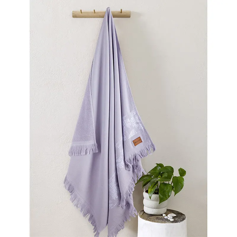 Η βαμβακερή πετσέτα θαλάσσης – πεστεμάλ Hula έχει υπέροχη μαλακή υφή και είναι πολύ εύκαμπτη, δίνοντας την δυνατότητα να φορεθεί και σαν παρεό. Η jacquard φάσα στο τελείωμά της διαθέτει ένα abstract μοτίβο, που της δίνει ένα ανάλαφρο και μοντέρνο ύφος. Διακριτικά κρόσσια στο τελείωμά της, δίνουν κίνηση και ταιριάζουν άψογα με την φυσική της υφή και το στιλ της. Το λιλά χρώμα της είναι χαρούμενο και φωτεινό, αγαπημένο για τις ξέγνοιαστες στιγμές στην παραλία. Είναι μια πετσέτα εξαιρετικά απαλή και απορροφητική, ιδανική για να προσφέρει στις καλοκαιρινές σας αποδράσεις άνεση και στυλ!